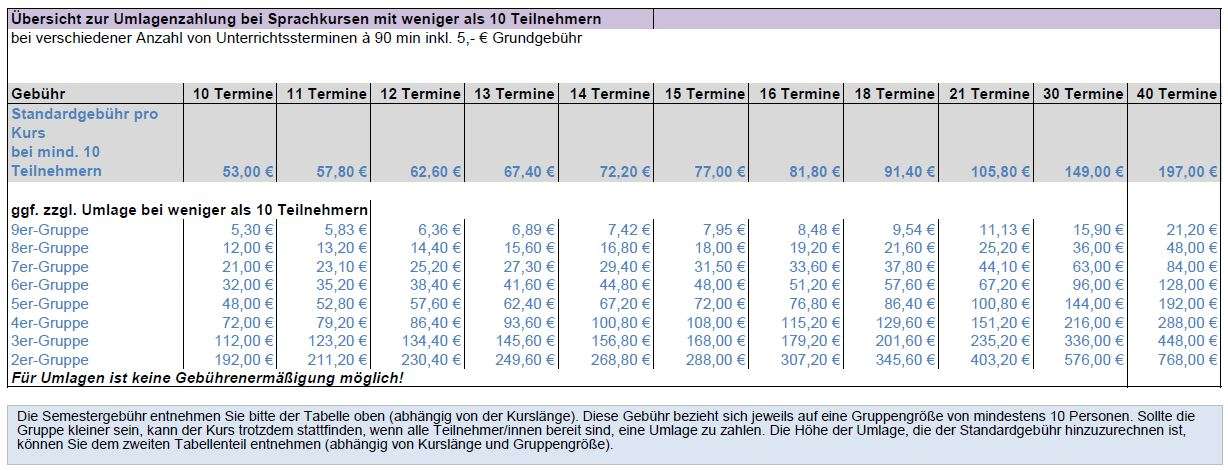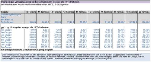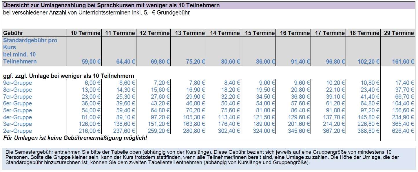 Die Semestergebühr entnehmen Sie bitte der Tabelle oben (abhängig von der Kurslänge). Diese Gebühr bezieht sich jeweils auf eine Gruppengröße von mindestens 10 Personen. Sollte die Gruppe kleiner sein, kann der Kurs trotzdem stattfinden, wenn alle Teilnehmer*innen bereit sind, eine Umlage zu zahlen. Die Höhe der Umlage, die der Standardgebühr hinzuzurechnen ist, können Sie dem zweiten Tabellenteil entnehmen (abhängig von Kurslänge und Gruppengröße).